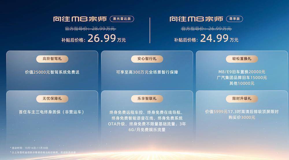 官方指导价26.99万元起,限时综合补贴后起售价24.99万元。补贴政策包括置换补贴最高2万元,激光雷达版用户可获价值2.5万元的辅助驾驶功能包及最高300万元智行保障。